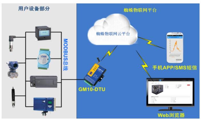 蜘蛛平台组成:用户设备、GSM10-DTU 模块、蜘蛛设备管理云平台和浏览终端(Web